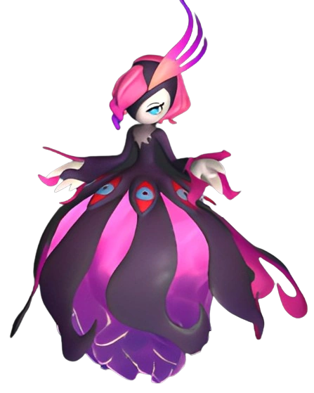 Bellanoir Libero is a tall, witch-like humanoid with a black gown-like body. Around its waist, there are blue, eye-like patterns. Instead of legs, pinkish-purple flames flicker beneath its skirt. Its arms have frayed sleeves ending in three white triangles, resembling hands. The left eye has long eyelashes and a blue pupil, while pink hair covers the right eye. An antler-like protrusion extends from the left side of its forehead, starting pink and fading to light purple at the tip.