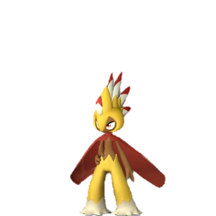 This Pal features a humanoid form, sporting a brown upper body and face, accented by what seems like yellow feathers adorning its legs and portions of its head. A row of long white feathers with a red tip crown the top of its head. Notably, it boasts a wide red cape draped across its back.